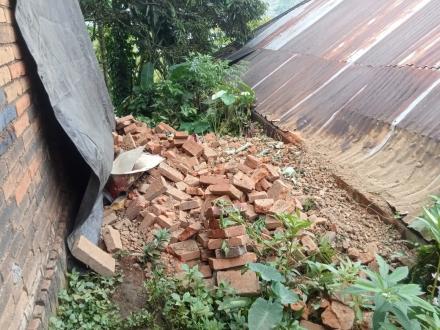 Rumah milik Komang Saguna salah satu temboknya jebol akibat tinggi curah hujan yang terjadi beberapa hari ini membuat ada pergeseran tanah yang menjadi tumpuan berdirinya bangunan. Tembok yang hanya terdiri dari tumpukan bata dan tanah liat ini tak kuasa menahan air yang terus mengalir di halaman rumahnya.