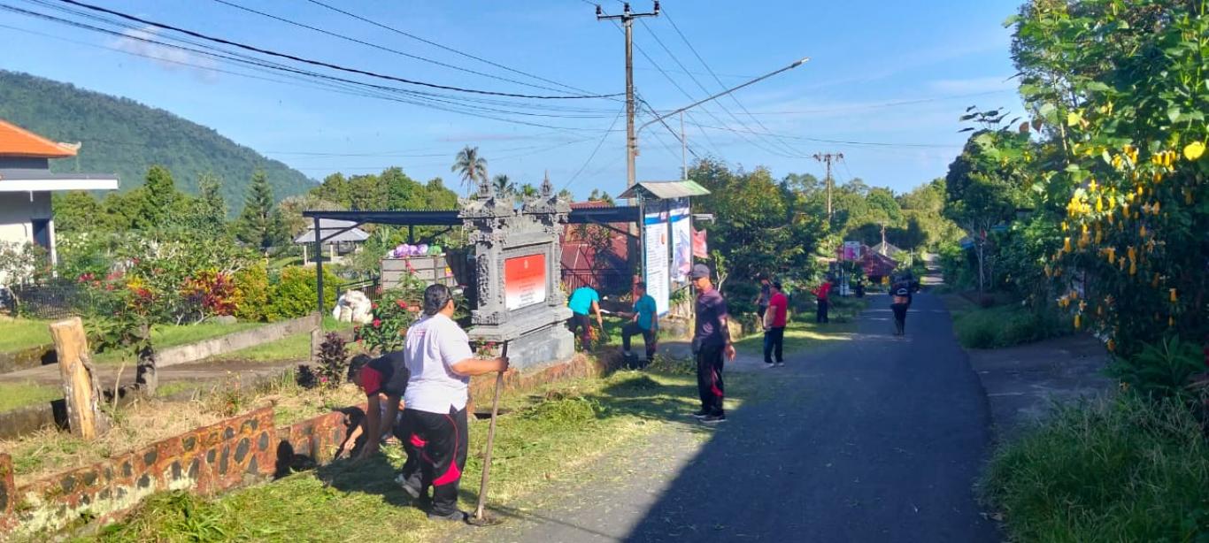 Galungan, Jumat 13 Maret 2026...Rutinitas bersih-bersih yang dilaksanakan setiap hari Jumat kembali dilaksanakan. Mengambil tempat diseputan kantor Perbekel bersih-bersih diawali dengan pemotongan rumput di depan kantor Desa.